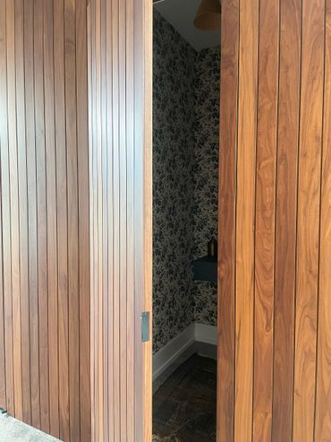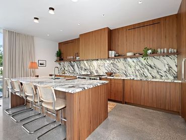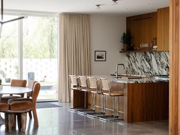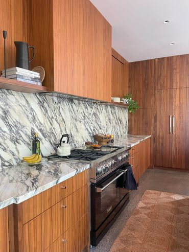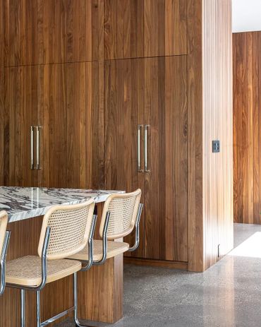 Built in 1972, this Mid-Century Modern ranch had seen better days. When our clients purchased this home, it was in a dilapidated condition. This gut renovation included a floor plan reconfiguration, modifications to structure, new HVAC, plumbing and electrical systems. MVA detailed the custom millwork throughout the home including the slatted walnut millwork panels that line the front entryway and lead into the kitchen. Our talented clients selected the stone, tile, lighting and furnishings.