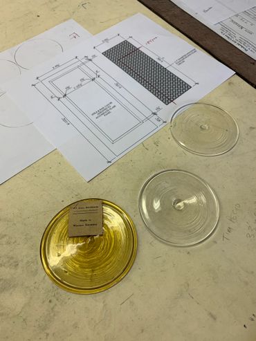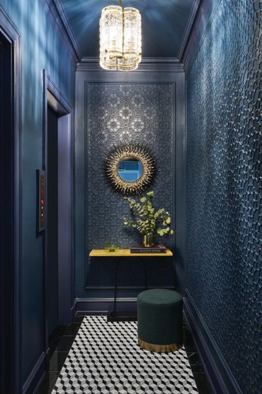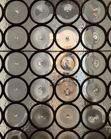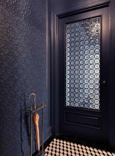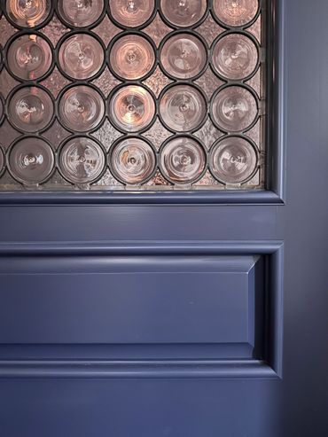 This private elevator vestibule in a 1920’s Chicago Co-op will make you want to stay a little longer. The hero of the space is the front entry door which embraces the slowness of craft and the beauty of objects created by human hand. Partnering with Chicago’s oldest stained-glass studio, we quickly found that sourcing the rondels - which are primarily blown in Germany - was going to be a challenge. Our extensive joint research led us to a Kansas City based glass blowing studio, who’s primary focus happens to be rondels. Once completed, the rondels were carefully packaged and shipped to Chicago where the leading process began. Between each rondel is a diamond shaped dimpled piece of translucent glass. Horizontal support bars were strategically incorporated into the panel to support the weight of the final layout of 7 rondels wide by 18 rondels high. Once fully leaded, the panel was transported to a custom millwork shop in Chicago where the wood doors’ stiles and rails were custom fabricated around the glass panel. The profiles were carefully matched to the historical profiles found throughout the building. After installation on site, the door was hand painted in a deep blue to match the surrounding space. The result is a testament to preserving traditional craftsmanship and the beauty of handmade.